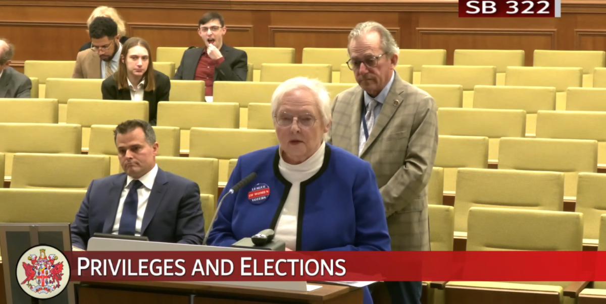 Jane D. Newell of the League of Women Voters of Virginia testifies at Senate committee hearing, with Senator Adam Ebbin, Chief Co-Patron of the bill (right) and Scott Drexel of National Popular Vote (left).