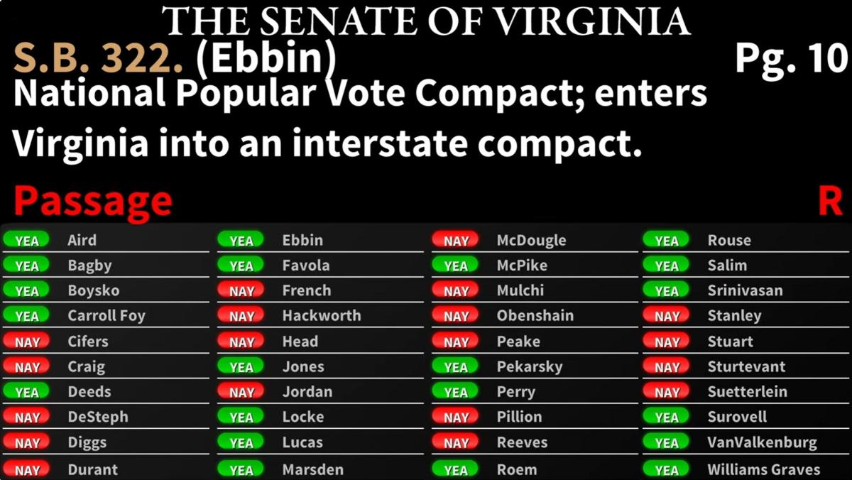On February 9, 2026, the Virginia Senate passed the National Popular Vote bill by a 21-19 vote (status of SB322). The bill now goes to the House.