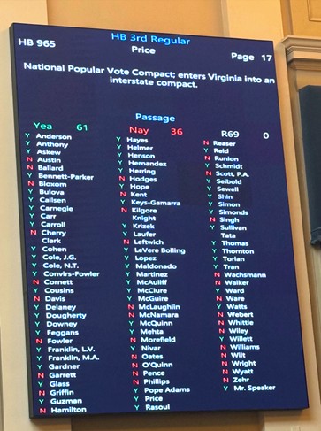 On February 12, 2026, the Virginia House of Delegates joined the Virginia Senate in passing the National Popular Vote bill. The bill passed the House on third reading by a 61-36 vote (status of HB965).