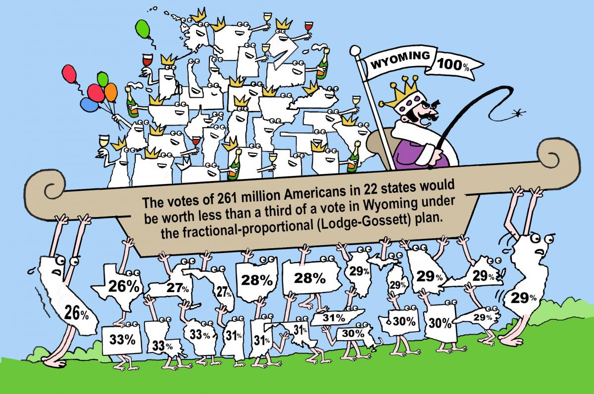 - The fractional proportional (Lodge-Gossett) method would definitely improve upon the current state-by-state winner-take-all method of awarding electoral votes, which results in three out of four states and three out of four voters in the United States being ignored in the general-election campaign for President. Every voter in every state would, for all practical purposes, be politically relevant under the fractional proportional method, and candidates would therefore have reason to campaign in every state.